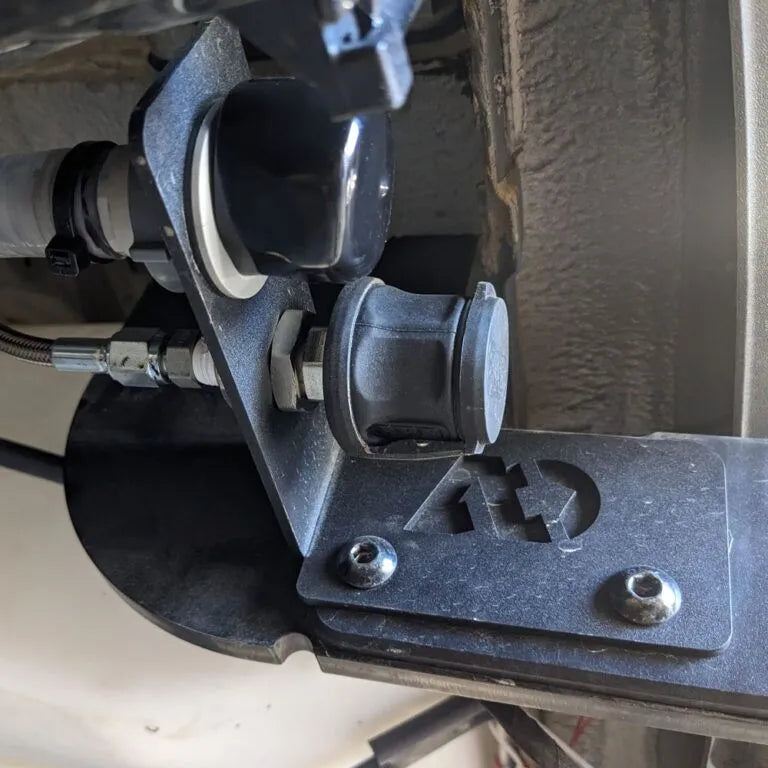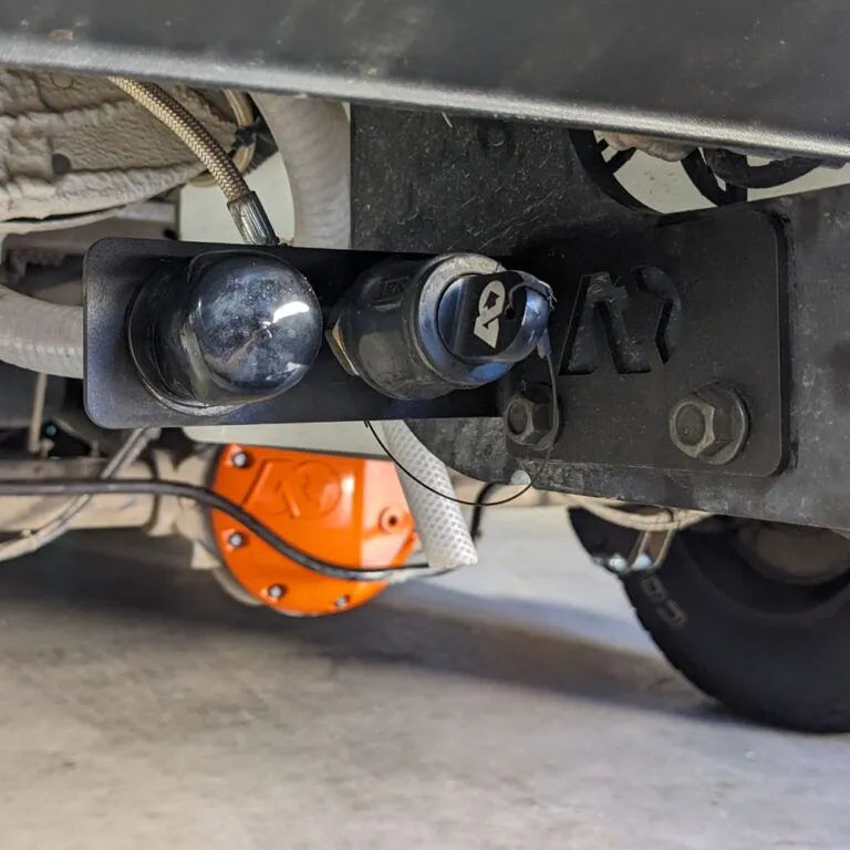 Mount a water inlet/outlet coupler and/or a air line fitting to your 2019+ Sprinter hitch. The A2 Hitch Bracket is a Bolt-On Sprinter Hitch Bracket For Air & Water Fittings and is a black powder-coated chromoly bracket designed to bolt into the existing holes on the factory 2019+ Sprinter hitch. Includes bracket and mounting hardware. *Water and air fittings sold separately.